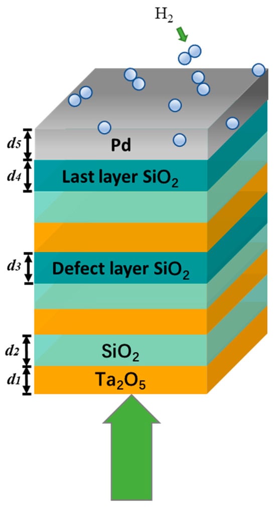 Figure 1 illustrates the schematic structure of the defect layer introduced to the photonic crystal. The system is composed of four parts: a DBR multilayer, a defect layer, a spacer layer, and a metal layer. The DBR multilayer consists of three pairs of high and low refractive index materials Ta2O5 (n1 = 2.11 at 0.792 μm) and SiO2 (n1 = 1.46 at 0.792 μm). The refractive index of Ta2O5 (n1) and SiO2 (n2) was obtained from the models and calculations of Gao and Rodríguez [33,34]. The thicknesses of the Ta2O5 and SiO2 alternating layers in each unit are d1 = 0.0937 μm and d2 = 0.137 μm, respectively, satisfying the Bragg condition (n1·d1 = n2·d2 = λ/4), where λ is the wavelength corresponding to the material refractive index [35]. The defect layer is a SiO2 layer with a thickness of d3 = 0.18 μm located below the fourth layer of the photonic crystal. It works by destroying the periodicity of the photonic crystal and forming a photonic local field, which leads to a coupling of defect modes and TPPs and enhances the local field [36,37]. The material forming the spacer layer is SiO2 (d4 = 0.054 μm), which strengthens the stability and durability of the structure by introducing a layer of SiO2 between the photonic crystal and the metal layer [38]. The key part of the sensor is the Pd metal layer at the bottom (Pd, d5 = 0.07 μm). Its role as a dedicated and highly sensitive hydrogen-sensitive material is crucial for detecting changes in hydrogen concentration. The refractive index of Pd was determined with reference to the results of the model designed and calculations formulated by Rakić et al. [39].
