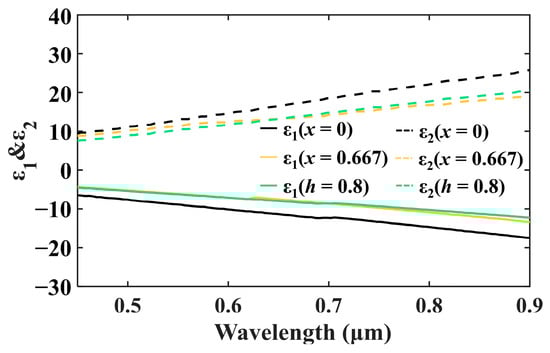 According to Figure 2, we have analyzed two different methods for describing the dielectric functions of Pd after hydrogen absorption. The black curve represents the dielectric function of pure palladium as measured by the ellipsometry method (the solid part is represented by a solid line and the imaginary part by a dashed line). Based on the measured dielectric function of pure palladium, we calculated the dielectric functions at a hydrogen concentration of 4 vol% in ambient nitrogen using Equation (1) and obtained the green curve in Figure 2 (the solid part is represented by a solid line and the dashed part by a dotted line). At the same time, we also calculated the Pd dielectric functions after hydrogen absorption saturation according to Equation (2) (where x is set to 0.667). The calculated results are shown as the yellow curve values in Figure 2 (the real part is represented by the solid line and the imaginary part by the dashed line). It is noteworthy that that the yellow and green curves calculated by these two methods almost coincide, thus verifying their feasibility in characterizing metallic palladium plasma sensing. Equation (2) can be used to describe the change in the dielectric functions of Pd after hydrogenation in a re-nitrogen environment with the passage of 4 vol% hydrogen.