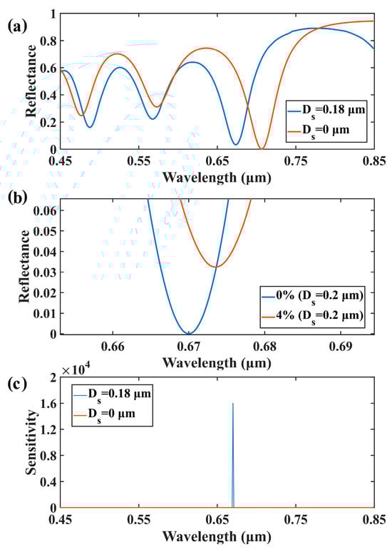 To assess the structure’s hydrogen-sensing performance, we compared the reflectance spectra of the TPP structure with the defect layer before and after the introduction of hydrogen (Figure 3b). We magnified the vertical axis of the reflectance spectra within the range of 0 to 0.07 to observe the changes in reflectance spectra resulting from the introduction of hydrogen. As depicted in Figure 3b, following exposure to 4 vol% H2, the resonance dip undergoes a red shift of 4 nm, and the reflectance at the resonant wavelength escalates from 3.25 × 10−6 to 5.21 × 10−2. In order to characterize the detection performance of the designed structure more intuitively, we calculate the responsivity before and after the passage of hydrogen and define it as the sensitivity of this sensor, i.e., Equation (3), where R1 and R0 represent the reflectance after exposure to hydrogen and the initial state [22], respectively. The computed sensitivity results are presented in Figure 3c. With the integration of a 0.18 μm defect layer into the photonic crystal, the structure’s sensitivity escalates from 31 to 16,020, representing an augmentation of nearly 516 times. Consequently, the inclusion of the defect layer proved instrumental in optimizing the resonance dip and consequently enhancing sensitivity.