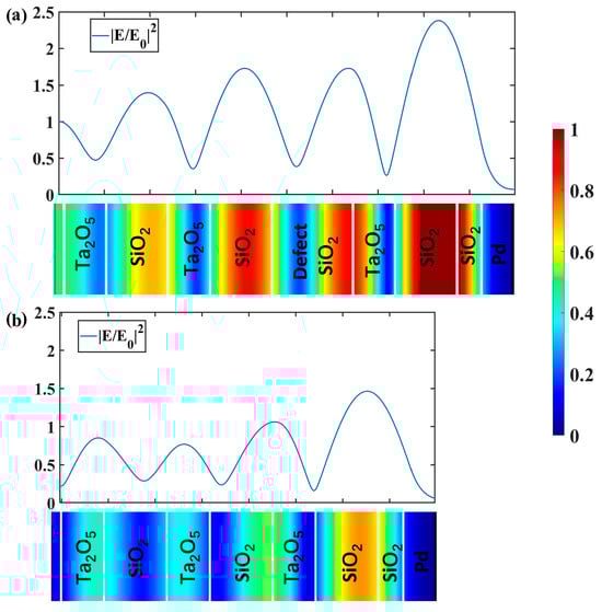 Simulation of the normalized electric field with and without a defect layer at a wavelength of 0.67 µm. (a) Electric field diagram when the thickness of the defect layer is 0.18 μm and (b) electric field diagram when the thickness of the defect layer is 0 μm.