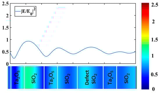 In this study, we also explored the excitation of defect modes and the coupling between TPPs and defect modes. To this end, we removed the Pd metal layer and the spacer layer and focused solely on the photonic crystal with the defect layer. Figure 5 displays the normalized electric field distribution inside the structure at a wavelength of 670 nm, with a defect layer thickness of 0.18 μm. Notably, the electric field intensity still exhibits an increase in the region of the defect layer, even without the presence of the TPP. This implies that the defect mode can be excited in the absence of the TPP. The comparison between Figure 4a and Figure 5 reveals that the magnetic field intensity near the defect layer in Figure 4a is considerably higher than that of Figure 5. This finding indicates that when the TPPs and defect modes are excited concurrently, they can couple with each other, resulting in the enhancement of TPPs and defect modes separately.