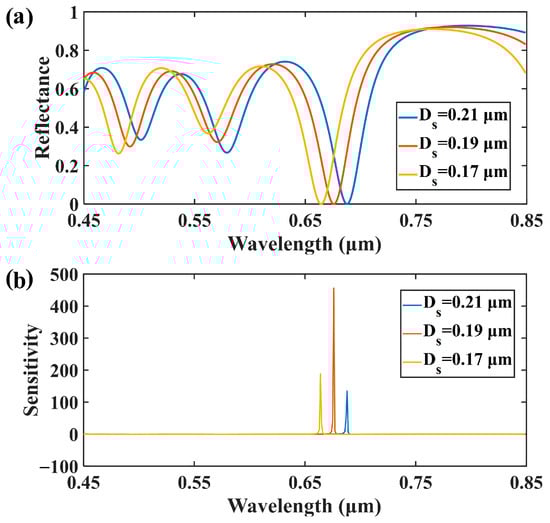 Since the thickness of the defect layer has a significant effect on this structure, the main focus of this study was to analyze the influence of the thickness of the defect layer on the TPP structure. Specifically, we calculated the reflectance spectra of the defect layers with thicknesses of 0.21, 0.19, and 0.17 μm (Figure 6a). It can be observed from the figure that the reflectance spectra all achieve good near-zero resonance dips in the visible band when the thickness of the defect layer is between 0.17 and 0.21 μm. In addition, as the thickness of the defect layer increases, the trough of the reflectance spectra is red shifted. This is because the change in defect layer thickness affects the intrinsic loss of the defect layer, which leads to a shift in the critical coupling wavelength [48]. Finally, the sensitivity of the defect layer was calculated using Equation (3) for the corresponding thickness (Figure 6b). It can be observed that the structure still has sufficient sensitivity performance in the defect layer thickness range of 0.17–0.21 μm, which provides a good margin of error for the preparation of the structure. Since the thickness of the defect layer is not linearly related to the variation in the hydrogen-sensing sensitivity of the structure, the structure requires a high degree of accuracy in the thickness of the defect layer. The design of this structure maintains good sensitivity in the defect layer thickness range of 0.17–0.21 µm, which also minimizes manufacturing difficulties.