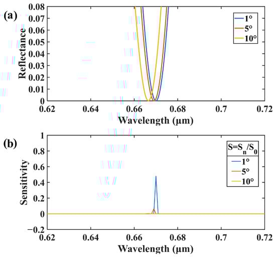 In practical applications, the sensing performance of sensors is also affected by the angle of incidence of light. Next, we will explore the relationship between the angle of incidence of light and the sensitivity of the TPP hydrogen sensor, as shown in Figure 7. In order to highlight the variations in the near-zero resonance dips of the reflectance spectra at different angles, we narrowed the calculated wavelength range. As shown in Figure 7a, the reflectance spectra of the structure were calculated in the wavelength range of 0.62 to 0.72 μm with the introduction of a defect layer of 0.18 μm thickness. It can be clearly seen that the resonance dips of the TPP hydrogen sensor exhibit good zero reflectance in all angular ranges from 1° to 10° and that they are slightly blue shifted with angle change.