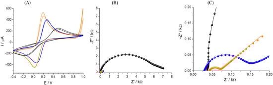 Cyclic voltammograms obtained in a 10 mM [Fe(CN)6]3−/4− solution prepared in 0.1 M KCl after different electrode fabrication steps: printing (black), 1 M Na2CO3 pretreatment (blue) and AuNP deposition (orange) (A); Nyquist spectra obtained in a 10 mM [Fe(CN)6]3−/4− prepared in 0.1 M KCl solution after different electrode fabrication steps: printing (black), 1 M Na2CO3 pretreatment (blue) and AuNP deposition (orange) (B); zoomed−in Nyquist spectra for the high−frequency area (C).
