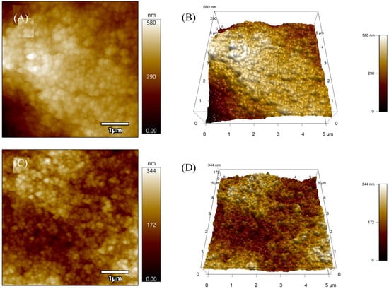 Two-dimensional (left) and three-dimensional (right) AFM topography images before (A,B) and after AuNP deposition (C,D). Scan size—5 µm.