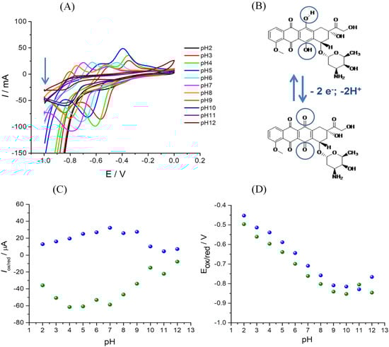 Cyclic voltammograms obtained for 100 μg/mL DOX solutions prepared in BRB, pH 2–12; The arrow indicates the starting potential in the voltammograms; (A); mechanism proposed for the oxidation of DOX (B); variation of the oxidation (blue) and reduction (green) peaks with the pH (C) and variation of the oxidation (blue) and reduction (green) potentials with the pH (D).