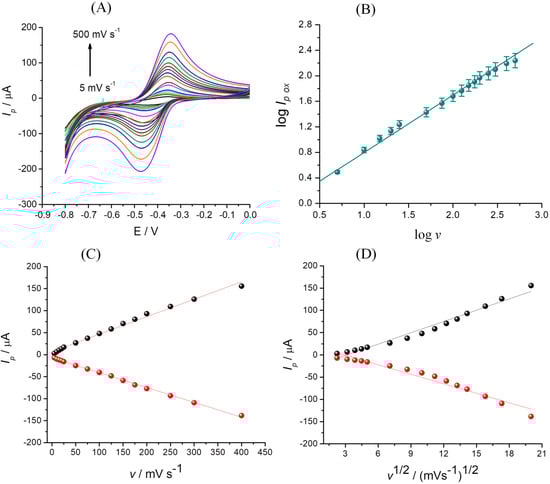 Cyclic voltammograms obtained for 500 μg/mL DOX solutions prepared in 0.1 M PBS, pH 7.4, at different scan rates (A); variation of the logarithm of the oxidation current with the logarithm of the scan rate (B); variation of the current peak with the scan rate (C) and square root of the scan rate (D).