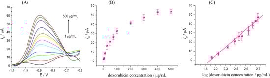 Differential pulse voltammograms obtained for increasing concentrations of DOX, as follows: 1; 5; 10; 25; 50; 75; 100; 200; 300; 400; 500 μg/mL, prepared in 0.1 M PBS, pH 7.4. DPV parameters—scan between −1.2 and −0.4 V, potential step 5 mV, amplitude 0.2 V, interval time 0.1 s, modulation time 0.05 s and scan rate 50 mV/s. Blank test (0.1 M PBS, pH 7.4) represented with black line (A); variation of the current intensity with the DOX concentration (B) and logarithmic calibration curve (C). Error bars represent the standard deviation for three measurements.
