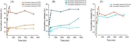 A higher release at pH 6 is convenient for drug delivery applications, since it is known that the pH of tumor tissues is more acidic than that of healthy tissues [54,55]. The cumulative release profiles obtained at pH 6 with the DPV and UV–Vis methods were compared (Figure 9C) and an average correlation of 94.32% (RSD 7.74) was determined, considering a 72 h release time.