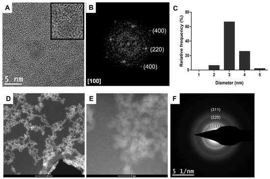 Regarding the profile of the absorption spectrum (Figure 1A, curve I), the as-synthesized QDs exhibited a broad absorption band, while the emission spectrum (Figure 1A, curve II) showed a narrow emission band with a maximum wavelength at ≈567 nm, like the ones found in the literature for the CdTe QDs [,]. The visual aspect of the QDs’ suspensions is represented in Figure 1B. The image on the left shows the suspension under visible light and the image on the right shows the suspension under UV light. The FT-IR spectrum of CdTe QDs (Figure 1C) presents a peak at 1540 cm−1 that corresponds to the asymmetric COO- stretching vibration, and another at 1364 cm−1 that corresponds to the symmetric COO- vibration, confirming the presence of TGA, since according to the literature [,]; the C = O and S-H stretching vibrations are typical of the FT-IR spectrum of TGA. However, we cannot observe the typical S-H vibration in the 2550–2600 cm−1 region, expected for thiols, because of the passivation of the surface of the CdTe QDs, in which the cadmium ions complex with the thiol functional group from TGA [,]. An intense peak between 3100–3600 cm−1 is related to O-H vibrations due to the presence of water. At 2848 and 2912 cm−1, there are two intense peaks that are a feature of the background because of the polyethylene sheet in which the sample was placed. Figure 2A depicts a high-resolution TEM image, and the inset shows a zoom-in of a single particle. The TEM analysis revealed a spherical shape and a narrow size distribution, with an average particle size (Figure 2C) of 3.26 ± 0.55 nm, which is in agreement with the determination of the nanocrystal size according to Equation (1) (3.40 ± 0.03 nm). The FFT pattern (Figure 2B) of the single particle represented in the inset of Figure 2A proves the nanocrystalline nature of QDs with diffraction spots corresponding to (2 2 0) and (4 0 0) lattice planes of the cubic CdTe. High-angle annular dark-field scanning transmission electron microscopy (HAADF-STEM) images at low and high magnification are presented in Figure 2D and Figure 2E, respectively. In Figure 2E, it is possible to observe the atomic resolution of CdTe quantum dots, as well as confirm the spherical-shaped particles. A typical SAED pattern from CdTe QDs is shown in Figure 2F, displaying three distinct diffractive rings that corresponded closely with the (1 1 1), (2 2 0), and (3 1 1) reflections of the cubic structure.