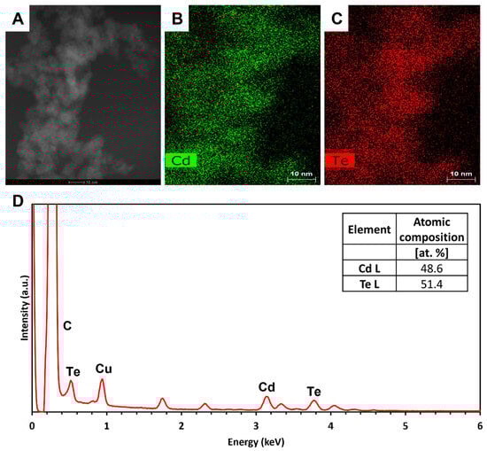 TGA-CdTe QDs EDX analysis of TGA-CdTe QDs from Run 7 of DoE. (A) HAADF−STEM image; EDX maps of the elements, (B) cadmium (green), and (C) tellurium (red). Scale bar: 10 nm. (D) EDX spectrum and inset the atomic composition (at. %) of cadmium and tellurium.