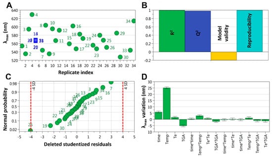 Statistical analysis of DoE. (A) Variation of the results; (B) summary of fit showcasing R2 (green bar), Q2 (blue bar), model validity (yellow bar), and reproducibility (cyan bar); (C) plotted residuals; (D) influence of the parameters’ coefficients on the λmax.