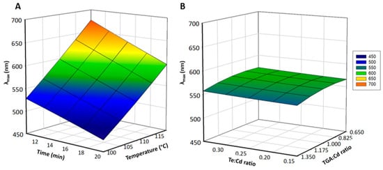 The resultant response surface plot from DoE is depicted in Figure 6. Overall, the surface charts show that the physical variables (time and temperature) showed a much larger impact on the response when compared with the chemical variables (Te:Cd and TGA:Cd ratios). Additionally, as can be seen, the λmax response function increased with the temperature and/or time for the studied inference space, ranging between 527.6 and 629.2 nm. In fact, the minimum λmax response was obtained for 90 °C, and the maximum λmax response was obtained using 130 °C, fixing the reaction time at 15 min, and with the Te:Cd and TGA:Cd ratios at 0.20 and 1.00, respectively. Regarding the time and TGA:Cd ratio, an opposite effect of similar magnitudes was observed between these, that is, higher λmax was obtained when using higher reaction times and lower TGA:Cd ratios.