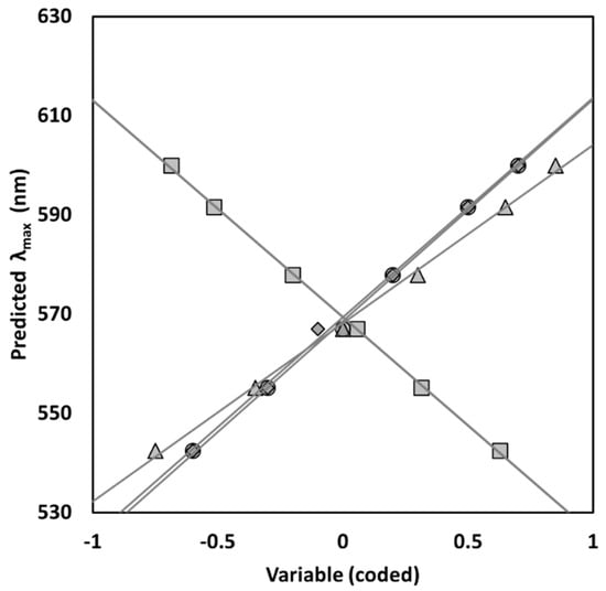where, as the function f is univocal, it is not biunivocal, that is, to each combination of the factors, there is only a single wavelength, but each possible wavelength may be obtained by using more than one combination of the factors. As such, the inverse function f−1 is not univocal and there is a need to include additional rules or conditions in order to ensure a suitable logical sequence of factor combinations. It should be noted that due to the experimental design combinations (Central Composite Design, CCD), no experiments were performed at extreme (low or high) values for more than one factor simultaneously. Thus, a set of experiments, named validation experiments (VE), was executed in order to confirm the range of λmax that could be obtained within the tested domain of the variables, as well as the impact of each variable. The model validity and accuracy were assessed by comparing the predicted results with those obtained after conducting the assays. The prediction of the experimental conditions that originate a specific response, λmax, was evaluated by choosing a set of values for the four independent variables provided by the simplified model obtained from the experimental design used in the synthesis’ optimization (Equation (4)). As already mentioned, the criteria for the assays were to choose combinations that resulted in the desired emission maximum wavelengths but that also presented a monotone variation. This can be achieved by optimizing the first derivative of the parameter (in order to λmax) instead of the parameter itself. Additionally, the factors’ combinations should not heavily deviate from the actual experiments of the experimental design to reduce the potential inaccuracy of the model due to extrapolation. This requirement derives from the fact that no experiments were performed using combinations of two or more factors simultaneously at absolute levels larger than 1 (coded value in DoE). The absolute level 2 for each factor was explored but with the remaining factors kept at level 0. To ensure the compliance with the above-mentioned conditions, in particular the monotonicity of the variation of the four factors, the values for each factor were defined by a first-degree linear function. Figure 7 represents the variation of predicted λmax as function of the coded variables (in the range [−1, +1]).