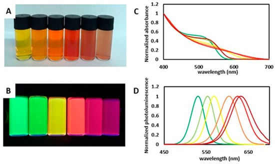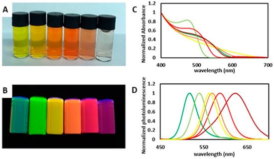 This assay was repeated thrice, on different days, and the run that corresponds to the central point (R3.VE) was repeated in the same day (R7.VE) in order to estimate the experimental reproducibility. The variation of the experimental λmax with regard to the predictions was suitably described by a straight line, without noticeable “intra-proposal” deviations, meaning that the chosen model (Equation (5)) was appropriate to the stated intent. Furthermore, the observed colors of the suspensions under visible and UV light, shown in Figure 8A and Figure 8B, respectively, are in-line with the predicted λmax ranges for each set of parameters. The QDs prepared in this set of conditions exhibited a broad absorbance spectrum (Figure 8C) and narrow emission bands as represented in the graph of Figure 8D, with maximum emission wavelengths ranging from 530 to 632 nm.