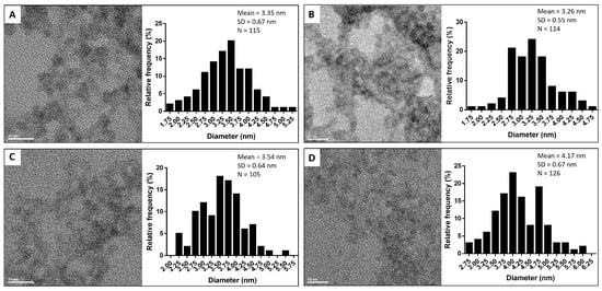 Despite this, we applied a FFT filter with Gaussian blur method to make the images clearer for readers. For green QDs (Figure 11A) (λMax = 539.6 nm), the calculated diameter was 3.12 nm, and in TEM, the resultant one was 3.35 nm. For the yellow QDs (Figure 11B) (λMax = 569.6 nm), the theoretical size was 3.42 nm, and that obtained by TEM was around 3.26 nm. For the orange QDs (Figure 11C) (λMax = 587.4 nm), the formula gives a diameter of 3.56 nm, and by TEM, the mean was 3.54 nm. For the last ones, the red QDs (Figure 11D) (λMax = 612.8 nm), Peng’s equation gives 3.78 nm and the obtained diameter given by TEM was 4.17 nm.