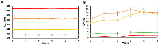 QDs stability assays performed for 5 weeks. (A) Summary of λmax stability tests. (B) Summary of QY stability tests. Each data point is the mean (n = 3) ± SD. (●—green QDs; ▲—yellow QDs; ■—orange QDs; ♦—red QDs).