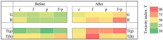 Integral toxicity of agricultural soils under soya crops (G), sunflower (H); wheat grown after soya (T(g)) and after sunflower T(h), determined using the V. aquamarinus VKPM B-11245 strain: c—control, f—fertilizers, p—pesticides, f + p—combined treatment. Before—sampling before pesticide application. After—sampling after pesticide application at the end of the growing season.
