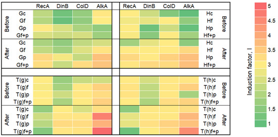 Genotoxicity of agricultural soils under soya crops (G), sunflower (H); wheat grown after soya (T(g)) and after sunflower T(h), determined using E. coli MG1655 (pRecA-lux), E. coli MG1655 (pDinB-lux), E. coli MG1655 (pColD-lux), E. coli MG1655 (pAlkA-lux) strains: c—control, f—fertilizers, p—pesticides, f + p—combined treatment. Before—sampling before pesticide application. After—sampling after pesticide application at the end of the growing season.