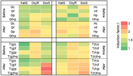 Pro-oxidant properties of agricultural soils under soya crops (G), sunflower (H); wheat grown after soya (T(g)) and after sunflower T(h), determined using E. coli MG 1655 (pKatG-lux), E. coli MG 1655 (pOxyR-lux), E. coli MG 1655 (pSoxS-lux) strains: c—control, f—fertilizers, p—pesticides, f + p—combined treatment. Before—sampling before pesticide application. After—sampling after pesticide application at the end of the growing season.