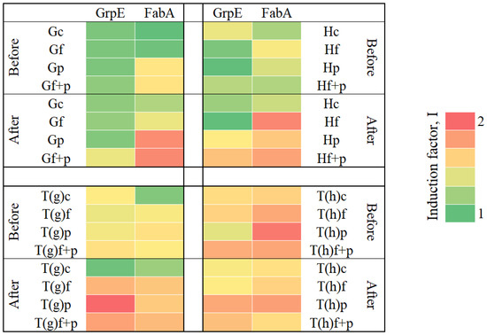 Protein- and membrane-damaging properties of agricultural soils under soya crops (G), sunflower (H); wheat grown after soya (T(g)) and after sunflower T(h), determined using E. coli MG1655 (pGrpE-lux) and E. coli MG1655 (pFabA-lux) strains: c—control, f—fertilizers, p—pesticides, f + p—combined treatment. Before—sampling before pesticide application. After—sampling after pesticide application at the end of the growing season.