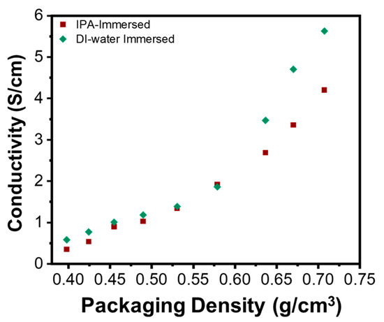 We conducted a comparison and analysis of the powder conductivity of graphene flakes synthesized under various conditions. Notably, the results highlighted the impact of the solvents added to the graphene dispersion on the powder conductivity of the graphene flakes. Figure 3 shows that the electrical conductivity of the graphene produced by adding DI water was as high as 1150 S/m at 20 MPa, which surpassed the conductivity values of graphene flakes with IPA addition. The results indicated that DI water-added graphene flakes were devoid of impurities, facilitating close contact between each graphene layer and resulting in low contact resistance. The powder conductivity of the graphene flakes was measured using two electrodes and a four-probe method. The powder conductivity was measured using the two-electrode method and plotted against the packing density of the powered graphene flakes, as in Figure 3. Using the four-probe method, the power conductivity of the graphene flakes was measured to be 1150 S/m at a pressure of 20 MPa.