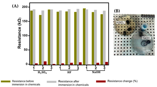 (A) Resistance measurements of LPEG–PTFE sensors before and after immersion in different chemicals: sulfuric acid, hydrofluoric acid, and sodium hydroxide. (B) Photograph of LPEG/PTFE Sensors after the immersion test.