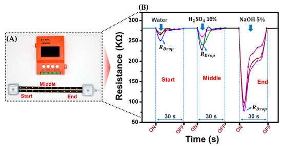 Following the successful synthesis and stability testing of the LPEG–PTFE sensor, the sensitivity of the sensor was further assessed through a series of tests involving various chemicals and concentrations, as depicted in Figure 6. For sensitivity evaluation, sensor lengths of 1 m were utilized, divided into three sections (start, middle, and end), to conduct tests with different chemicals: water, 10% sulfuric acid (H2SO4), and 5% sodium hydroxide (NaOH). Resistance values were measured using a resistance meter, as illustrated in Figure 6A. Each test upon exposure to different chemicals lasted approximately 30 s. The “ON” point denotes the exposure of sensors to the chemicals, while “RDrop” signifies the point at which resistance immediately dropped to the minimum upon contact with the chemicals. Subsequently, when the chemicals on the sensor strip were removed, the resistance of the sensors recovered back to original value within 5 to 25 s and stabilized afterwards, as depicted in Figure 6B. These results provide compelling evidence of the durability and reusability of the sensors, making them suitable for industrial and commercial applications. Chemical leak detection sensors with durability and reusability have the potential to revolutionize various industries by offering continuous, reliable, and real-time monitoring of harsh environments. The integration of such sensors into industrial settings can significantly enhance maintenance practices, monitoring capabilities, and safety protocols.