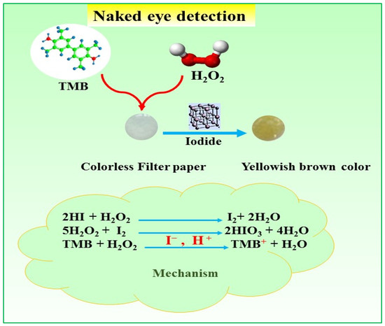 The sensor demonstrated a remarkable colorimetric response; this was due to its exceptional characteristics, which enabled the efficient detection of I− ions in the presence of TMB and H2O2. The complex process that underlies this response, as shown in Figure 1, provided an insight into the basic working of the modified filter paper-based sensor. With TMB acting as a substrate for chromogenic peroxidase, the sensor effectively detected iodide by utilizing its built-in sensitivity. As shown in Figure 1, I− ions and H2O2 combined to form a catalytic reaction in which I− ions oxidized H2O2, thereby serving as a catalytic oxidizing agent. The color of the filter paper substrate changed significantly from being colorless to yellowish-brown due to the catalytic process.