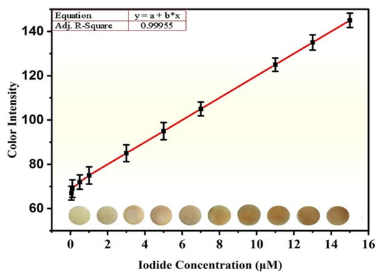 The quantitative detection of iodide was carried out under optimized conditions. Initially, the color intensity was increased steadily as the concentration of I− ions increased, and a significant intensification was observed after the addition of 4 µM of iodide, as shown in Figure 2. The sensing performance of the proposed sensor was observed in a broad linear range of 0.01 to 15 × 10−6 M and the limit of detection for I− ions was found to be as low as 0.125 × 10−6 M and could be compared well with the already-reported literature, as displayed in Table S1. The LOD of an analyte was calculated using the formula given,
