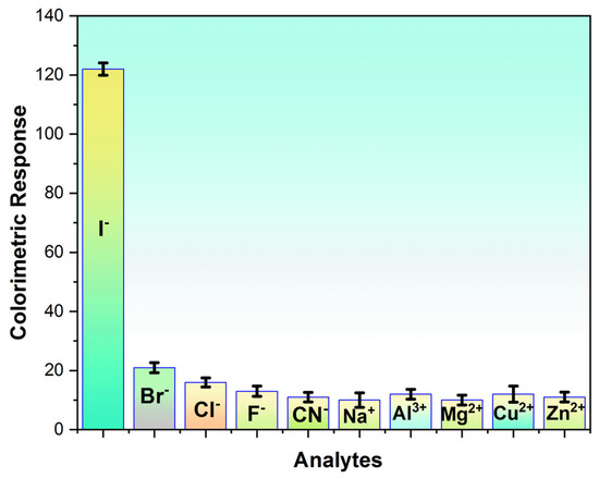 Achieving high chemical selectivity is an essential goal for any sensing platform, especially in situations where possible interference could exist and make detection difficult. As can be seen from Figure 3, except for I− ions, none of the ions tested produced a noticeable color change. Moreover, this response was selective and consistent with what is known about the behavior of halide ions during catalytic oxidation; I− ions are more catalytically active than fluoride (F−), chloride (Cl−), bromide (Br−), cyanide (CN−), sodium (Na+), aluminum (Al3+), magnesium (Mg2+), copper (Cu2+), and zinc (Zn2+) ions. I− ions are superior reducing agents because they are larger in size and have a greater tendency to donate electrons. Iodide functions as a reducing agent in the reaction between oxidized TMB and iodide ions, causing the oxidized TMB to return to its original state while the iodide itself oxidizes to produce iodine (I2).