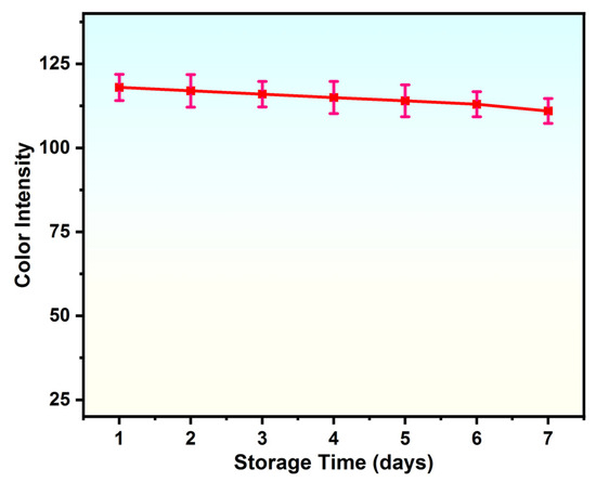 Stability makes an assay feasible and economical by guaranteeing its precision, sensitivity, repeatability, and reliability. Reliable data from stable colorimetric detection systems is necessary for environmental, medical, and scientific applications. The stability of the proposed sensor was evaluated by observing changes in the intensity of the color over a period of seven days under already-optimized conditions. The proposed sensor (Figure 4) revealed minimal performance changes, signifying its reasonable stability with an RSD value of less than 5%.