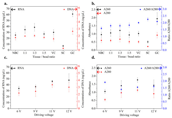 In the second test, the driving voltage of the micro-homogenizer varied between 6 V and 12 V to find its optimal setting. A tissue:bead ratio of 1:3 was kept from the previous test. As shown in Figure 3c, samples lysed with driving voltages of 11 V and 12 V had higher yields than those of lower driving voltages. However, 12 V occasionally caused unexpected motor shutdown and was determined to be inappropriate for further testing. The 11 V sample resulted in a relatively high A260 value (nucleic acids) compared to that of the rest of the samples, although the purity was not the highest due to a high A280 value (proteins) (Figure 3d). Consequently, the combination of a tissue/bead ratio of 1:3 and a driving voltage of 11 V was considered optimal and used throughout the rest of this study.