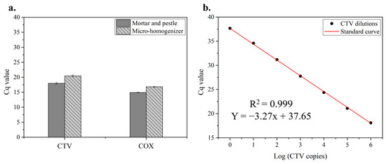 Validation of RNA extracts acquired from maceration with OmniLyse micro-homogenizer. (a) Evaluation of the efficacies of mortar-and-pestle grinding and micro-homogenizer maceration by comparing Cq values of CTV and COX (N = 18). (b) Cq vs. Log CTV copies based on RT–qPCR assay of CTV positive control (PC) and its serial dilutions (10−1–10−6), (N = 3).