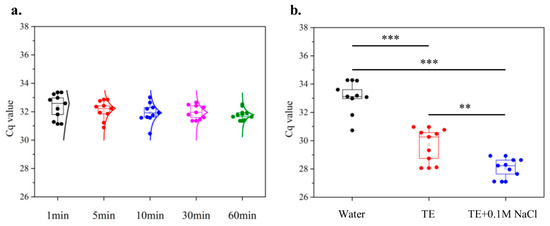 For this purpose, untreated paper disks (d = 0.25 in) were characterized in terms of soaking time and the compositions of elution buffers while using the same CTV source and guanidine lysis buffer. In the soaking time tests (N = 9), various periods (1, 5, 10, 30, and 60 min) were selected to test the correlation between soaking time and the amount of nucleic acid captured. As shown in Figure 6a, 5 min soaking yielded acceptable Cq values with good consistency compared to the 1 min case, whereas longer soaking (10 min and 30 min cases) did not provide better results (i.e., lower Cq). Although a slightly narrower distribution was achieved after 60 min of soaking, such a small gain was not justifiable against the short processing time (5 min soaking). The results indicated that the binding of nucleic acids to paper was rapid, quickly approaching a plateau in the first few minutes after the paper was dipped into the lysate.