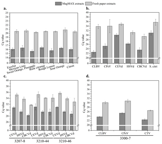 Next, we tested untreated paper disks for detecting single-infected samples where the pathogens included two RNA viruses (CLBV and CPsV), three viroids (CEVd, HSVd, and CBCVd), and one bacterium (S. citri), as listed in Table 1. The paper disk method resulted in the following Cq values (N = 9): CLBV (33.81 ± 0.95), CPsV (33.99 ± 2.92), CEVd (34.85 ± 0.57), HSVd (31.17 ± 0.73), CBCVd (29.44 ± 0.99), and S. citri (35.68 ± 1.35) (Figure 7b). The benchtop method with MagMAX yielded smaller Cq values for all pathogens: CLBV (22.52 ± 0.77), CPsV (25.18 ± 1.00), CEVd (30.05 ± 0.71), HSVd (26.21 ± 0.50), CBCVd (23.49 ± 0.95), and S. citri (30.98 ± 0.96). The Cq differences between the two methods ranged from 4.70 to 11.29, with the highest and lowest found in CLBV and S. citri. It is also important to note that both the paper disk and the benchtop methods had 100% true positive rates for all pathogens without exception. For assay stability, all the assays of both methods demonstrated a low level of both intra- and inter-assay CV (<4%) except for the CPsV assay with the paper disk method, where a more significant deviation (up to 9.38% in inter-assay CV) was found.