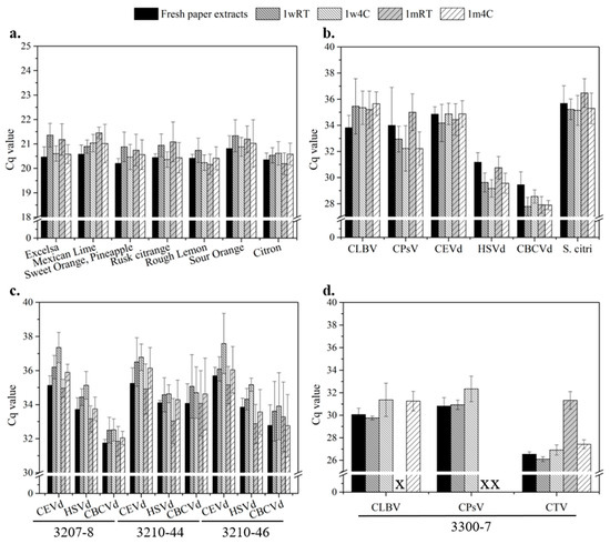 As shown in Figure 8b, the results of the pathogen nucleic acids on paper disks under different storage conditions were quite variable, where the greatest Cq difference compared to the fresh extract was 1.84 (1m4C for CLBV, N = 9), while the smallest one was −2.01 (1w4C for HSVd, N = 9). According to the statistical analyses (Table S9a), both the assays of CEVd and S. citri demonstrated low Cq difference (<0.8) without statistical significance compared to their fresh counterparts, where the responses were considered stable and well compatible with paper disks. By contrast, regardless of conditions, the remaining assays all demonstrated varying extents of significant deviations (−2.01–1.84) in Cq compared to the fresh extracts. For example, the Cq differences of CLBV were high (1.39–1.84) and broadly observed in all the samples, which implied that any storage condition could remarkably affect CLBV paper disks. However, most Cq from stored CPsV, HSVd, and CBCVd samples was significantly lower (∆Cq: −0.89–−2.01) than the fresh extracts. This finding could indicate either no impact or better performance with the stored samples. It is more likely that inhibitors/buffers retained in wet and fresh paper disks suppressed qPCR reactions.