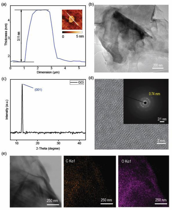 The graphene oxide (GO) nanosheets were synthesized from plastic wastes through chemical reactions (details are presented in the Material Synthesis and Preparation section). From the atomic force microscopy (AFM) image shown in Figure 1a, a typical GO nanosheet showed an ultra-thin sheet morphology with a lateral dimension of ~2 µm and a thickness of ~3.11 nm, which falls into the main range of statistical distribution between 1.8 and 2.3 µm for the lateral dimension and between 2 and 4 nm for thickness (Figure S4). Such a sheet-like morphology was further confirmed by the transmission electron microscope (TEM) image shown in Figure 1b. An X-ray diffraction analysis (XRD) was utilized to study the crystal structure of the obtained GO; as shown in Figure 1c, a substantial sharp peak was found at ~12° of 2-theta, which can be associated with the (001) plane [39,40,41,42]. From the high-resolution transmission electron microscopy (HRTEM) image with the corresponding selected area electron diffraction (SAED) pattern (Figure 1d and the inset), the GO nanosheet exhibited a polycrystalline nature with a d-spacing of 0.74 nm, measured as the (001) plane, which is in good agreement with previous studies as well as our XRD result [40,41,42,43,44]. The elemental composition of the material was investigated using electron spectroscopy (EDS); as shown in Figure 1e, the EDS mappings of C and O elements were identified and matched well with the electron image (Figure 1e), revealing that the formed graphene nanosheet was simultaneously oxidized during the synthesis process, eventually converting it to graphene oxide.