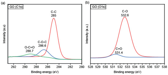 X-ray photoelectron spectroscopy (XPS) was conducted to study the chemical compounds in the GO nanosheet (Figure 2). In the C 1s spectrum shown in Figure 2a, three peaks were observed at the binding energies of ~285, ~286.6, and ~288.9 eV, which can be assigned to the non-oxygenated ring C–C, the carbonyl C=O, and the carboxylate carbon O=C–O, respectively [39,45,46,47]. On the other hand, according to the O 1s spectrum shown in Figure 2b, the XPS peaks of the C=O and C-O bonds were found at ~531.1 and ~532.4 eV, respectively. Before deconvolution, Shirley’s background subtraction method was employed. This step was necessary due to the occurrence of inelastic scattering events that are experienced by the photoelectrons during their transit from the excitation point to the sample surface. These events contribute to the inelastic background intensity, which must be subtracted to isolate the areas corresponding to the individual peaks. The XPS spectra of C 1s and O 1s were fitted using Gaussian–Lorentzian (GL30) functions to delineate the respective components, utilizing the characteristic binding energy (BE) values for carbon and oxygen 1s photoelectrons obtained from the relevant literature [45,47,48,49,50]. It is worth noting that the energy peak of C-O was significantly larger than that of the C=O peak, suggesting that a single bond between carbon and oxygen atoms considerably outweighs a double bond in graphene oxide, which is consistent with previous reports [51,52,53,54].