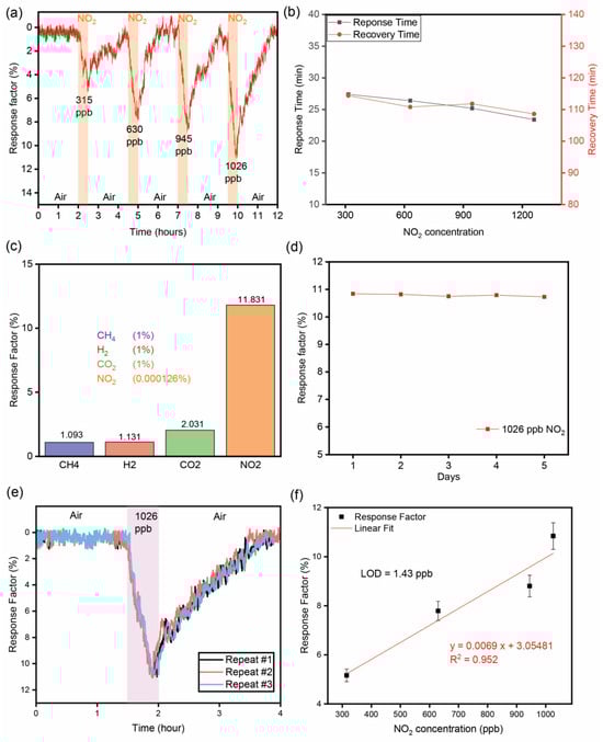 The gas sensing performance of graphene oxide. (a) Dynamic sensing performance of GO flakes towards NO2 gas at concentrations ranging from 315 ppb to 1026 ppb in a dark environment at room temperature. (b) Response time and recovery time at a change of 90% of the full magnitude change of the gas response factor. (c) Measured crosstalk of graphene oxide sensor towards CH4, H2, CO2, and NO2 (1026 ppb). (d) Long-term stability test. (e) Repeatability. (f) Limit of detection (LOD) calculation based on four groups of experimental datasets, in which the detection limit of GO was estimated to be 1.43 ppb.