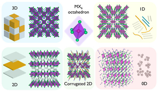 Generally, LHP material can be divided into 3D nanocubeset, 2D nanosheet, one-dimensional (1D) wire, and zero-dimensional (0D) quantum dot in morphology. Despite their different dimensions, all LHPs have the same crystal structure at the molecular level [17] and exhibit size-related properties such as quantum limiting effects at the nanoscale [18]. Low-dimension LHP is a kind of organic–inorganic hybrid material. The suitable selection of an organic component in LHP results in a change in its crystal structure and LHP dimension at the molecular level [19,20]. Interestingly, the macro-crystal of low-dimension LHP exhibits the same characteristics as the crystal unit structure. If the size of organic cations in LHP is too large, the cations cannot be integrated into the 3D framework. Therefore, 2D LHP material with layered or corrugated inorganic layers can be obtained, and the organic cations are in the inorganic layers. For 1D perovskite material, the inorganic octahedrons form a chain structure in a co-angular, co-sided, or co-planar manner, and this is surrounded by organic cations. For 0D LHP material, the isolated inorganic octahedrons are completely isolated by organic cations. The crystal structures of typical 3D, 2D, 1D, and 0D LHP materials are shown in Figure 1.