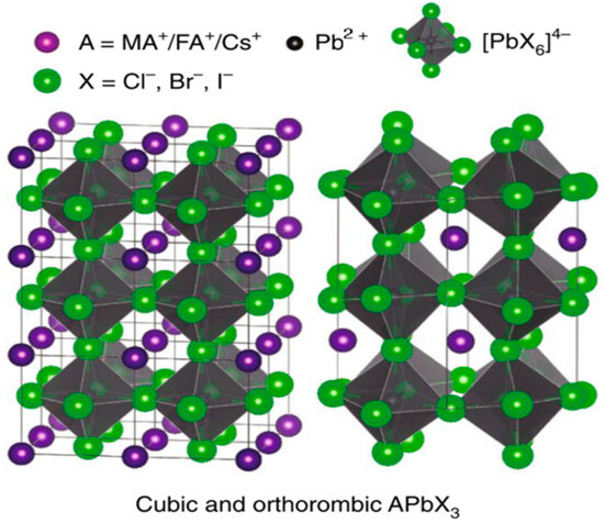 As shown in Figure 2, a standard 3D LHP, ABX3, is composed of A, monovalent cation (Cs+, CH3NH3+ as MA+, CH(NH2)2+ as FA+ in the figure); B, a bivalent metal cation Pb2+; and X, a monovalent halogen anion (Cl−, Br−, I−) [21]. The lead halide octahedron [PbX6]4, formed by the coordination of Pb2+ and six halide anions, forms a spatially angular shared 3D framework with monovalent cations located in the void of the lead halide octahedron framework. LHP can be divided into total inorganic perovskite and organic–inorganic hybrid perovskite according to the different cation at the A position. In order to determine the combination of cations and anions in LHP, Goldschmidt proposed the tolerance factor t based on the oxide perovskite in 1926, which is now widely used to measure the structural stability of an LHP. The calculation formula can be shown as t = (RA + RX)/√2(RB + RX). In the formula, RA, RB, and RX are the ionic radii of the A, B, or X position, respectively. When f is in the range of 0.81 < t < 1.11, an LHP with the ABX3 type maintains a stable 3D structure. If the f value is beyond this range, the crystal structure of an LHP will decrease its dimension [22,23].