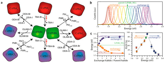 Overview of the different routes and precursors for the anion exchange reactions on CsPbX3 (X = Cl, Br, I) NCs; (a) PL spectra of the CsPb(Br:X)3 (X = Cl, I) NCs prepared by anion exchange from CsPbBr3 NCs. (b) A targeted emission energy could be obtained by adding a precise amount of halide precursor to a crude solution of CsPbBr3 NCs. (c) The curves are reported as a function of the molar ratio between the added halide (or exchange halide) and the Br amount in the starting CsPbBr3 NCs, as well as the PLQY recorded on the exchanged NCs [39].