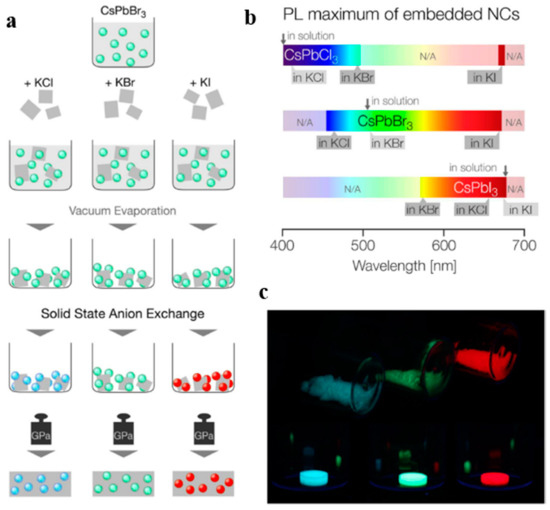 (a) Scheme of the embedding and halide exchange procedure of CsPbBr3 NCs into different KX (X = Cl, Br, or I) salts; (b) Overview of the anion exchange process of pure CsPbX3 (X = Cl, Br, or I) NCs embedded into various ionic matrices (KCl, KBr or KI). The spectral positions of the embedded perovskites in each pure salt are also shown. “N/A” indicates spectral regions that cannot be achieved; (c) True color image of CsPbBr3 NCs loaded on KX (X = Cl, Br, and I from left to right, respectively) salts and incorporated into KX pellets under 365 nm illumination [49].