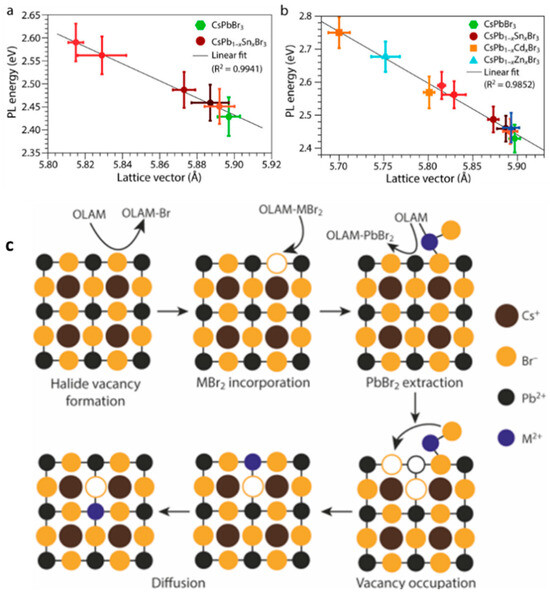 Koscher et al. [51] conducted an in-depth discussion on the halogen exchange process of CsPbBr3 NCs. They found that CsPbBr3 NCs have a different mechanism of halogen exchange with I− and Cl−. As soon as reaction with I− occurs, CsPbBr3 NCs is alloyed rapidly. The reaction process is a uniexponential surface-reaction-limited exchange process. When Cl− is exchanged, it is carried out exponentially. This intermediate conversion presents a diffusion-limited exchange process, which is more complicated than the halogen exchange of I− due to the different ionic bond energy and ion migration rate. Compared with halogen anion exchange, the study on the cation exchange started relatively late and is less studied, but it is still of great significance [52,53]. Stam et al. [54] systematically studied the process and mechanism of M cation exchange between Pb2+ and MBr2 (M = Sn2+, Cd2+, and Zn2+) in CsPbBr3 NCs. Compared with the halogen exchange process, the activation energy of Pb2+ cation exchange (2.31 eV) is much higher than that of vacancy-induced halogen anion exchange (0.58 eV in the case of I−). Therefore, halogen anion exchange can be completed in a few minutes at room temperature, while the cation exchange process takes 16 h at room temperature. The product, CsPb1−xMxBr3 (0 < x ≤ 0.1), can maintain the cubic crystal structure of the original CsPbBr3 NCs after the cation exchange. Its PL peak shows a significant blue shift, which is independent of the type of M, and only linearly correlated with the lattice vector of PNCs (Figure 6a,b). In addition, the CsPb1−xMxBr3 is of the blue light emission with a higher PLQY and narrower half-peak width. It shows better optical properties than the products after Cl− exchange. Based on this interesting phenomenon, they conducted a profound analysis of its mechanism, and concluded that the main reason for this phenomenon is the lattice contraction of PNCs. Generally, the entire exchange process can be divided into four processes (Figure 6c). Firstly, oleylamine (OLAM) interacts with CsPbBr3 NCs to generate OLAM−Br and form a Br vacancy on the surface of PNCs. Subsequently, OLAM−MBr2 enters the Br vacancy and releases energy, which breaks the bond between PbBr2 and PNCs, and the formed PbBr2 vacancy is occupied by MBr2. The energy releases in this process is basically equivalent to the energy of the broken bond, completing the exchange of M with Pb2+, and diffusing inward along the Br vacancy. With the increase in inward exchange and diffusion M, the lattice shrinkage of CsPbBr3 NCs is caused by the difference of ionic radius (r (Pb2+) = 119 pm, r (Cd2+) = 95 pm, r (Zn2+) = 74 pm, and r (Sn2+) = 118 pm). As a result, the lattice stress inside CsPbBr3 NCs continues to increase, counteracting the increase in entropy of the system, and finally the exchange stops. This is a self-limited diffusion process. In addition, due to the effect of lattice shrinkage, the increase in the Pb−Br effect and the energy of the anti-bonding orbital composed of Pb (6p) and Br (4p) s results in the upward shift of the bottom end of the conduction band. The small influence of the Br (4p6) orbit and Pb (6s2), as well as the valence band change, increases the band gap width, resulting in the blue shift of the emission peak [54]. These results are important in understanding the cation exchange of LHP NCs.