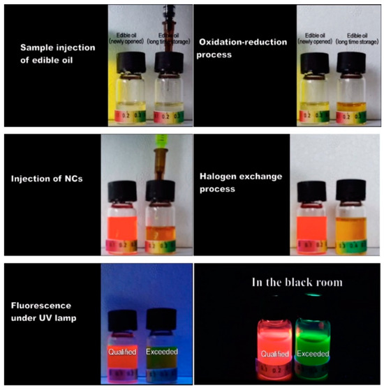 Photos of the process of fluorescence sensing for peroxide number of edible oil using CsPbBr3 NCs, including the redox process, halogen exchange process, and fluorescence comparison process (365 nm UV irradiation) from top to bottom [58].