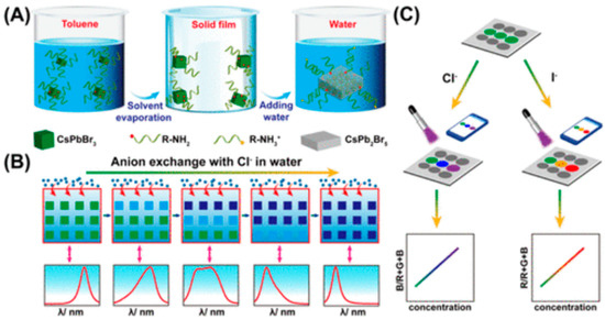 A wavelength shift method based on the halide exchange of CsPbBr3 NCs and Cl− has been developed in order to realize the rapid colorimetric sensing of Cl− in sweat [60]. The study indicates that CsPbBr3 NCs could achieve halide exchange with Cl− in the aqueous phase, accompanying a significant wavelength blue shift and vivid color change. A novel water-dispersed nanocrystalline (W−PNC) with a strong PL and excellent water stability has been synthesized by Chen et. al. [61] using oleamine (OAm) CsPbBr3@CsPb2Br5 by oil–solid–water phase transition. It is not necessary to immobilize W−PNCs in a dense polymer or an inorganic material. As indicated in Figure 8, the analytes could be directly detected in the water phase by chemical reactions. They studied the ion exchange between W−PNCs and halide ions as well as its effect on the PL wavelength of nanocrystals in water. They also developed a novel colorimetric sensing platform for halide ions using a smart phone.