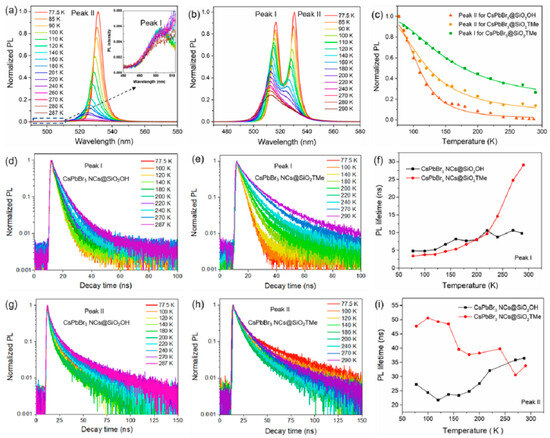 Temperature-dependent steady-state PL spectra for (a) CsPbBr3 NCs@h−SiO2OH and (b) CsPbBr3 NCs@h−SiO2TMe, and (c) the variations in PL intensity as a function of temperature and fitting with the Arrhenius equation. Temperature-dependent TRPL spectra for the (d,g) CsPbBr3 NCs@h−SiO2OH and (e,h) CsPbBr3 NCs@h−SiO2TMe. The average PL lifetimes for the CsPbBr3 NCs@h−SiO2OH and CsPbBr3 NCs@h−SiO2TMe monitored at (f) peak I and (i) peak II. The sample was synthesized using a 0.2 M precursor solution [85].