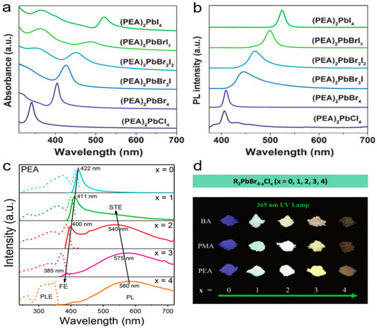 (a) Absorption and (b) PL spectra of PEA2PbX4 [101], (c) PL and excitation spectra of PEA2PbBr4−xClx, and (d) photographs of R2PbBr4−xClx under UV light [102].