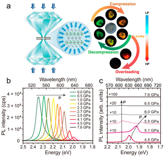 The study of pressure sensing is important to understand the relationship between the optical properties and the structure of perovskites and then expand their application. The 2D LHP shows a sensing ability for thermodynamic parameters. Pressure can effectively regulate the electronic and crystal structure of 2D LHP. As shown in Figure 16, Liu et al. [105] reported that pressure can induce a reversible shift of the emission wavelength of the 2D LHP PEA2PbI4. At a moderate pressure of 0–3.5 GPa, the PL of PEA2PbI4 gradually changes from green to red. This phenomenon is attributed to the fact that the organic part of PEA2PbI4 is able to contract and stretch flexibly, thus adapting to the different pressure. During the pressurization process, the compressed organic layer absorbs energy and changes the band gap of the 2D LHP. When the pressure is reduced, the organic layer releases the absorbed energy, thus achieving a reversible shift in the PL wavelength. When the pressure exceeds the critical value, the crystal structure is irreversibly destroyed, and the PL completely disappears.